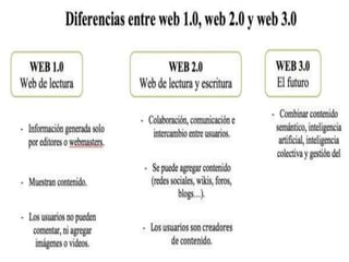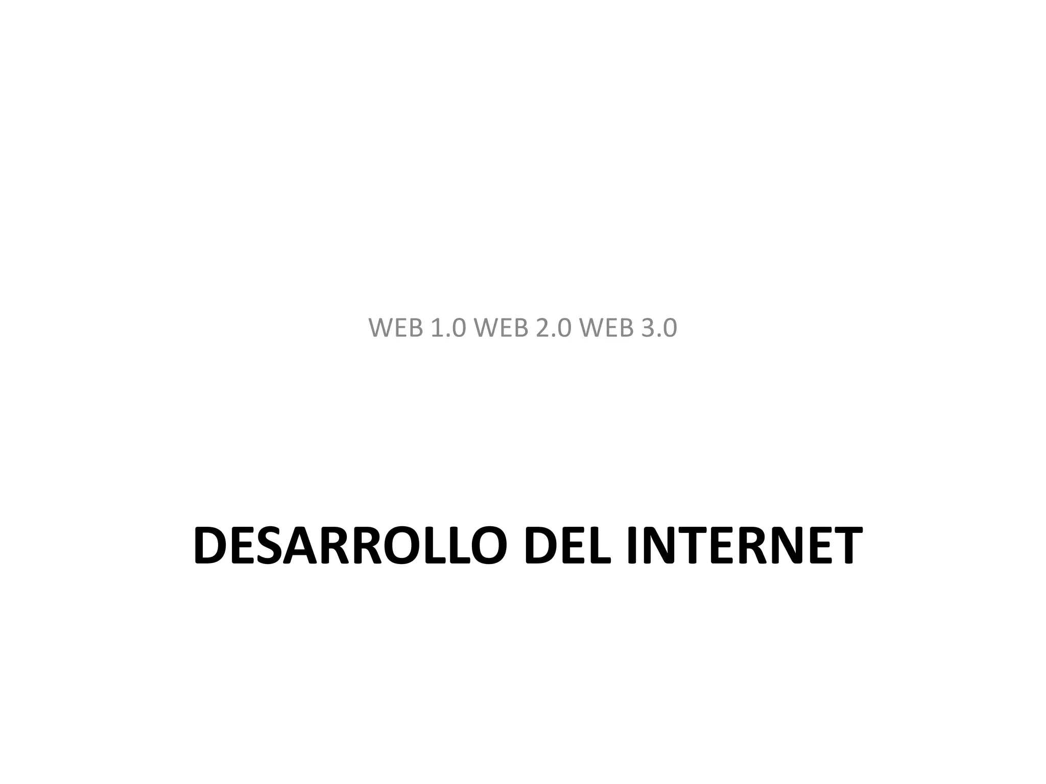 El documento describe la evolución del Internet a través de las eras Web 1.0, 2.0 y 3.0, enfocándose en el desarrollo tecnológico y las características de cada era, concluyendo con un agradecimiento.