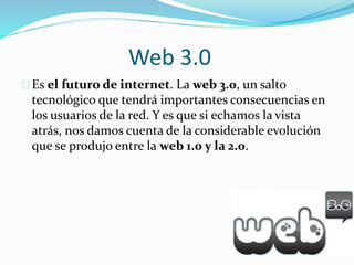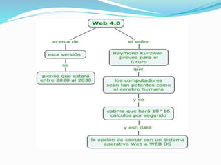 La Web 3.0 representa el futuro de Internet con la inteligencia artificial y la combinación de inteligencia humana y de máquinas. Permitirá el acceso a información más rica, relevante y oportuna a través de lenguajes más potentes, redes neuronales y algoritmos. La Web 4.0 se refiere a predicciones sobre una web ubicua donde los dispositivos se comuniquen entre sí para tomar decisiones, según el científico Raymond Kurzweil, quien acertó predicciones tecnológicas como la derrota de Kasparov