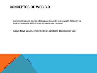 El documento describe los conceptos de la Web 3.0, la cual se refiere a la evolución de la interacción en la web a través de diferentes caminos. Explica que la Web Semántica dotará a la web de mayor significado a través de lenguajes universales que permitan encontrar información de forma más rápida. También señala que aunque la Web 3.0 y la Web Semántica a menudo se usan como sinónimos, la Web 3.0 se refiere a una etapa futura mientras que la Web Semántica es un proceso evolutivo