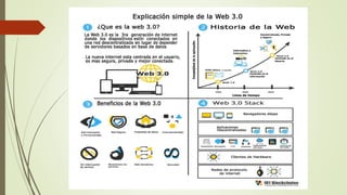 La web 1.0 permitía a los usuarios acceder a información almacenada de forma estática en servidores. La web 2.0 introdujo servicios que facilitan el intercambio y la interacción de datos entre usuarios, como las redes sociales. La web 3.0, también conocida como web semántica, permitirá a las máquinas entender y procesar datos de forma más inteligente para mejorar la experiencia del usuario a través de búsquedas más sofisticadas y mayor conectividad entre dispositivos.