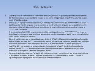 El documento describe lo que es la Web 3.0. Se menciona que varios expertos han propuesto definiciones diferentes de la Web 3.0 que no siempre coinciden. La Web 3.0 permitiría que los agentes de software comprendan y usen el lenguaje en la Web de la misma forma que los humanos. También se la describe como una evolución de la Web Semántica que permitiría encontrar y compartir información más fácilmente gracias al uso de la inteligencia artificial.