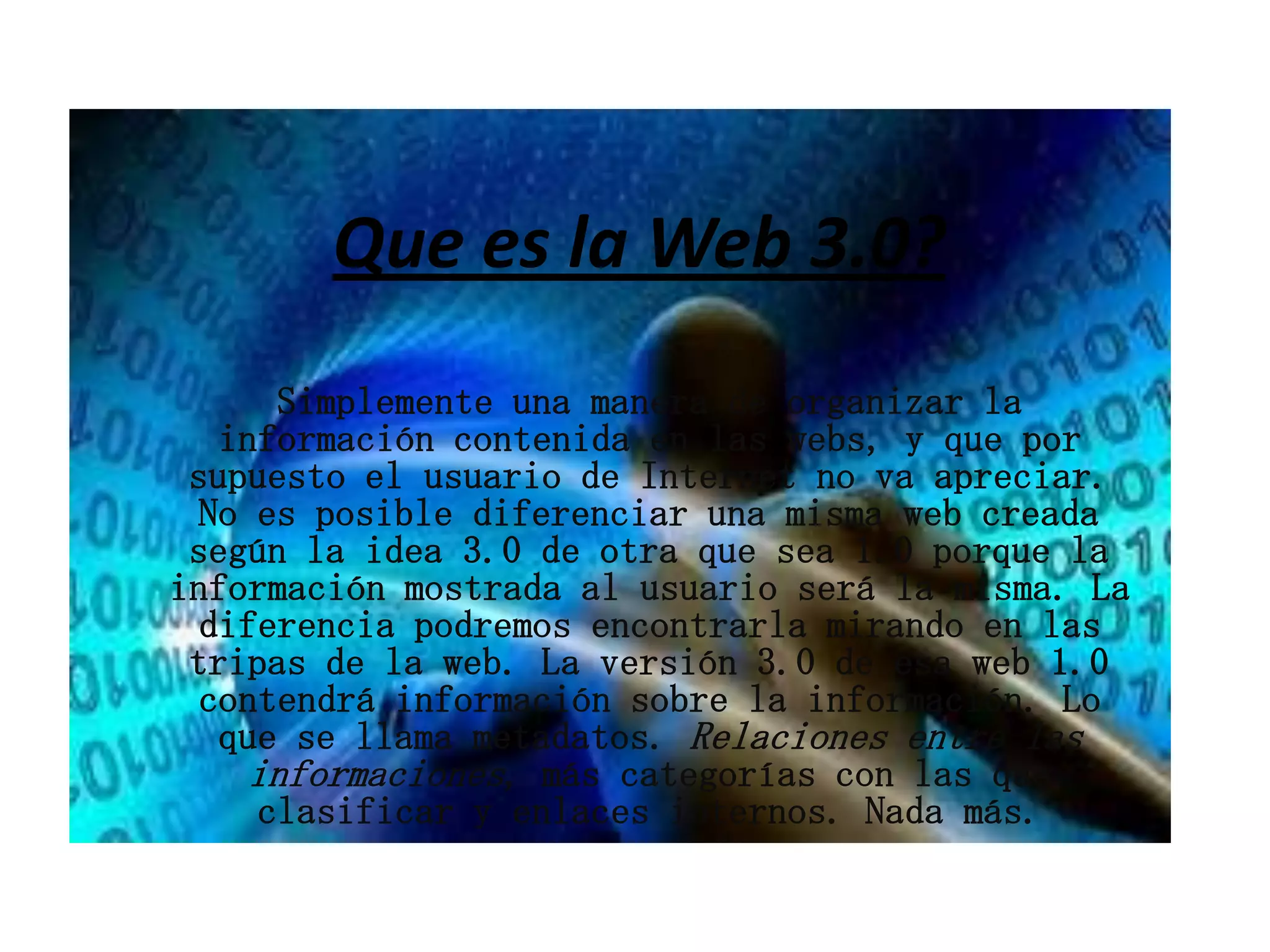 La Web 3.0 se refiere a organizar mejor la información contenida en las páginas web mediante el uso de metadatos y relaciones entre datos para que los computadores puedan procesarla de forma más precisa y rápida. Esto permitiría aplicaciones como programas que puedan encontrar y combinar automáticamente información de diferentes sitios web de una manera que actualmente requiere la intervención humana. Para que esto ocurra, la información en las páginas web necesitaría expresarse de forma que sea legible para los computadores usando sintaxis más estrictas
