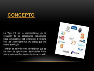 La Web 2.0 permite que los usuarios generen y compartan contenido en lugar de solo consumirlo. Se caracteriza por permitir la participación y colaboración entre usuarios a través de blogs, redes sociales y wikis. La Web 2.0 ha democratizado los medios permitiendo que cualquier persona publique noticias y contenidos en línea.