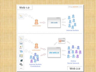 La Web 2.0 representa la transición de aplicaciones tradicionales de escritorio a aplicaciones basadas en la web enfocadas en el usuario final que fomentan la colaboración y reemplazan servicios de escritorio. La Web 1.0 se refiere al estado inicial de la World Wide Web antes del impacto de la fiebre punto com en 2001 y las páginas se desarrollaban principalmente en HTML, JavaScript y CGI de forma limitada.