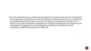 La web semántica describe la evolución de Internet hacia una base de datos distribuida que permite una mejor organización y recuperación de información mediante la adición de contenido semántico a los documentos. Esto facilita que los buscadores encuentren información relevante y que los usuarios compartan y modifiquen contenidos de forma más sencilla entre múltiples servicios. Sin embargo, la implementación completa de la web semántica aún enfrenta desafíos como la codificación y normalización de estándares semánticos entre idiomas.