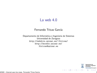 Este documento presenta la evolución de la web desde la Web 1.0 hasta la Web 4.0 inteligente, con ejemplos como Google Now y Google Glasses. También discute conceptos como la ubicuidad, la inteligencia distribuida y el uso de datos abiertos para crear aplicaciones. Finalmente, hace predicciones sobre la fusión entre humanos y tecnología a través de nanobots en el cerebro.