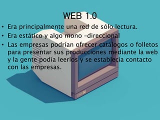 El documento describe las diferencias entre la Web 1.0, 2.0 y 3.0. La Web 1.0 era principalmente de solo lectura y estática, mientras que la Web 2.0 permitió mayor interactividad y control de los usuarios sobre la información. La Web 3.0 se ejecuta desde cualquier dispositivo y permite almacenar preferencias de usuarios para proporcionar contenido más personalizado de manera dinámica en la nube.