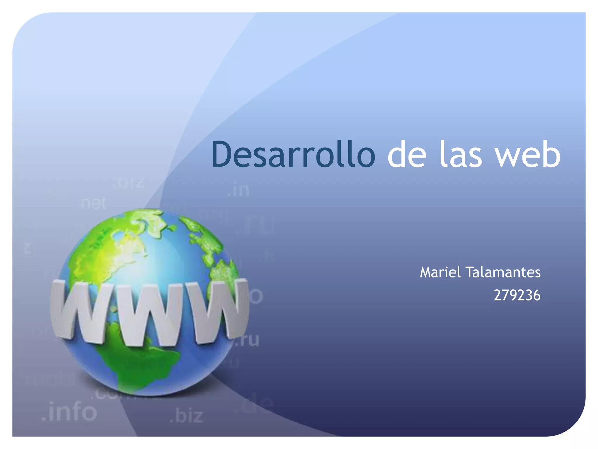El documento resume los principales hitos en el desarrollo de la web desde 1997 hasta 2016, incluyendo el lanzamiento de Google en 1998, el proyecto SETI@home en 1999, el estallido de la burbuja punto com en 2000, el lanzamiento de Wikipedia en 2001, el aumento de la popularidad de VoIP y redes sociales como MySpace y Facebook en los años siguientes, y el desarrollo continuo de nuevas tecnologías móviles e Internet de las cosas.