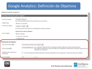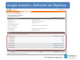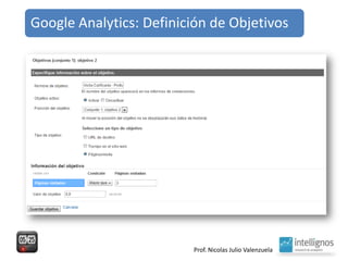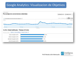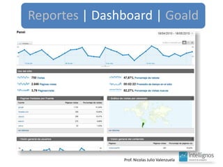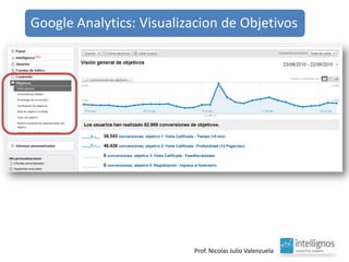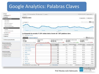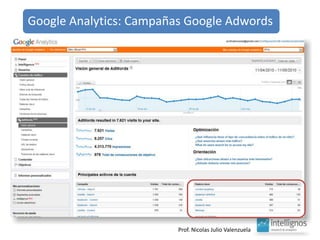 El documento aborda el análisis del tráfico y comportamiento en línea a través de herramientas como Google Analytics, que proporciona estadísticas sobre el uso y procedencia de visitas. Destaca la importancia de indicadores como el porcentaje de rebote y el posicionamiento geográfico de productos, así como la optimización de contenido y fuentes de tráfico. También sugiere la necesidad de mantener una curiosidad constante para generar nuevas ideas.