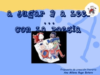 Este documento propone una actividad literaria para niños sobre la creación de poemas. Se introducen diferentes formas de poesía como acrósticos, caligramas y limericks. Luego se detallan las tareas que incluyen explorar la poesía, leer fragmentos de un libro y crear un acróstico, caligrama o limerick. Finalmente, se enumeran los recursos como libros, videos y guías que apoyarán el proceso creativo.