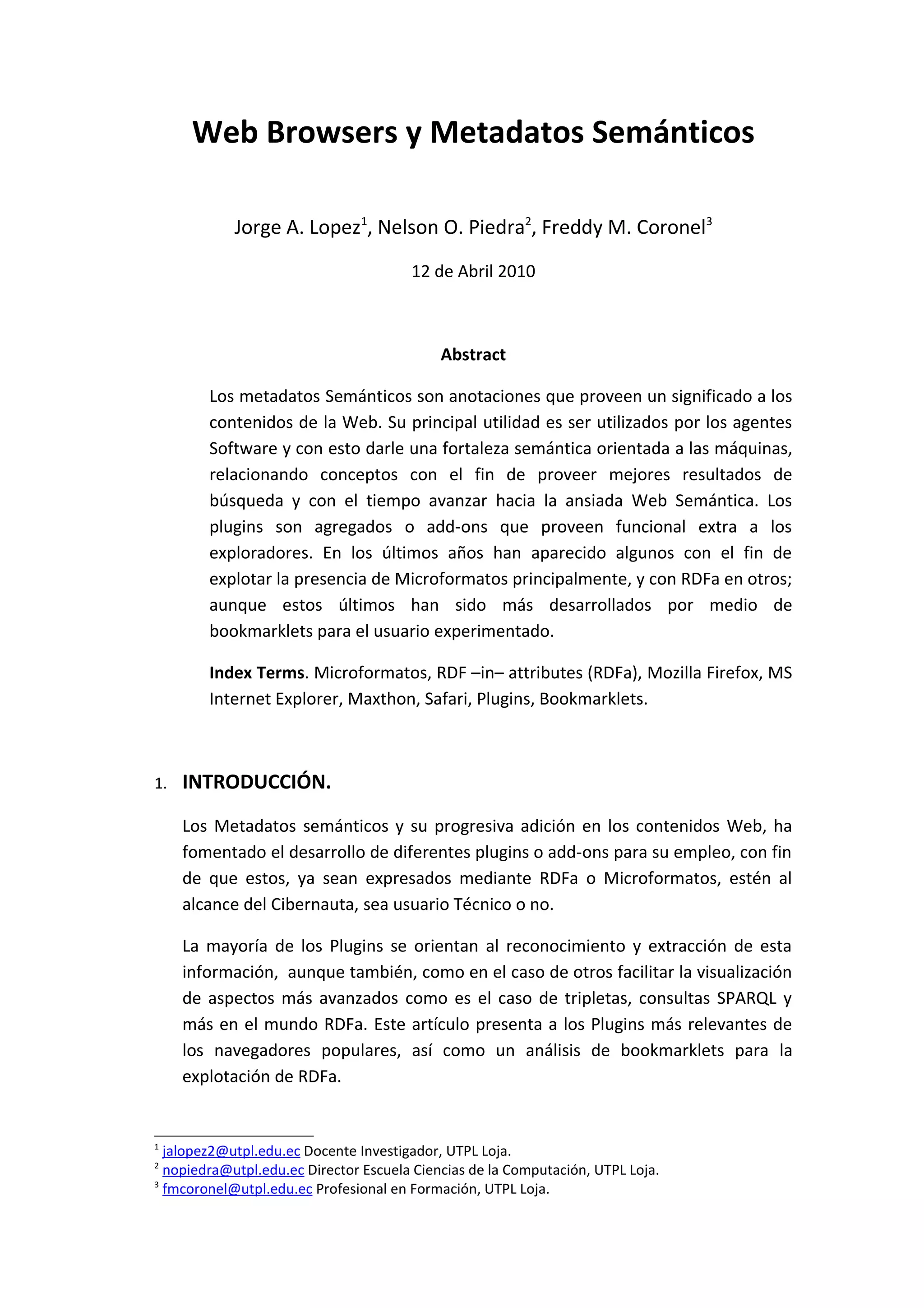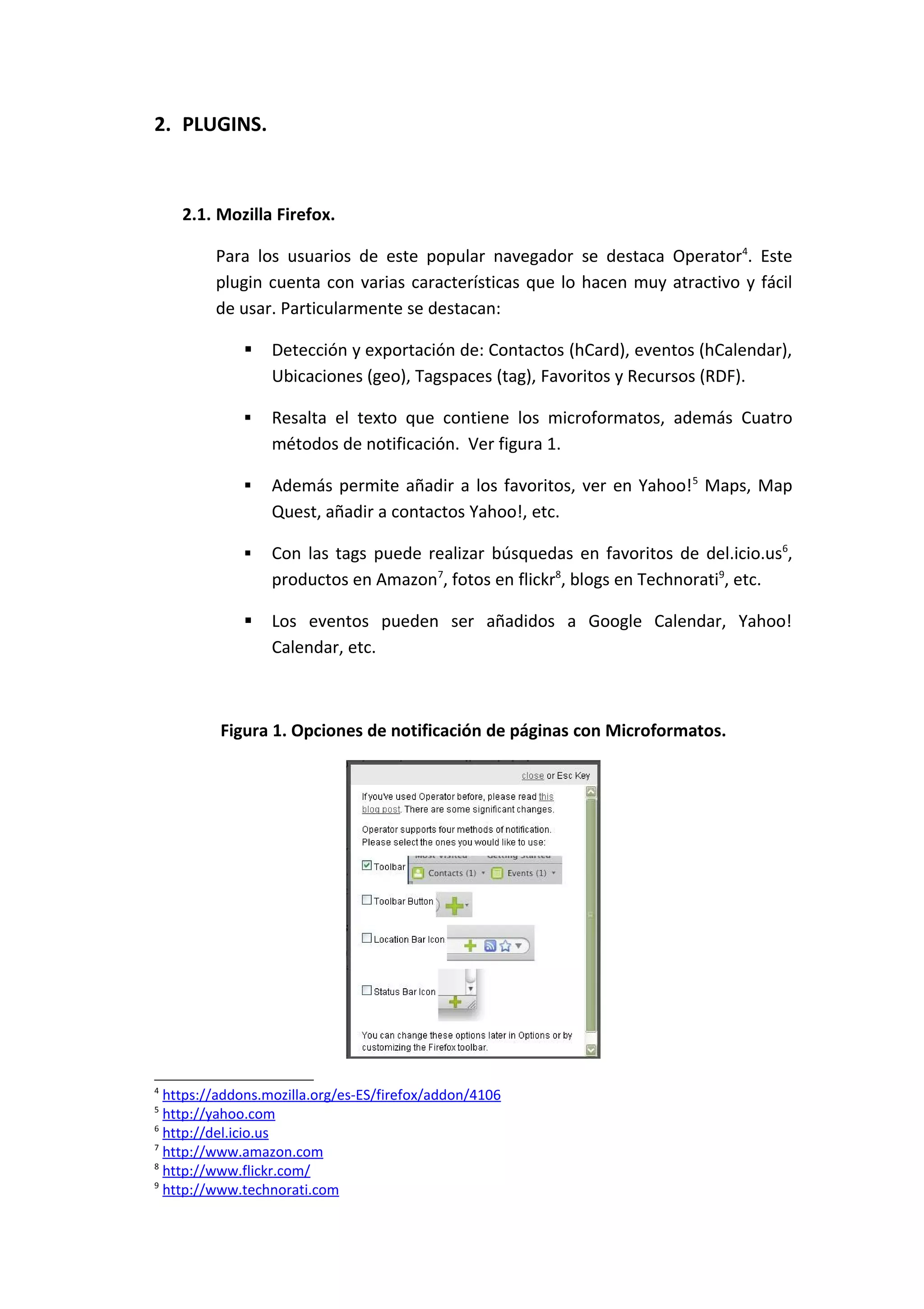 Este documento describe varios plugins y bookmarklets para exploradores web que permiten detectar y explotar metadatos semánticos como microformatos y RDFa. Describe plugins como Operator para Firefox, Safari Microformats para Safari, y Oomph para Internet Explorer, los cuales permiten detectar y exportar información contenida en microformatos. También describe bookmarklets como RDFa Highlight y RDFa Clipboard que resaltan y permiten copiar texto con RDFa. Finalmente, analiza las capacidades y limitaciones de estos plugins y bookmarklets para explotar metadatos semánticos.
