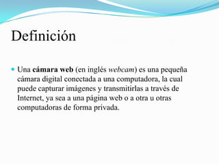 Una cámara web es una pequeña cámara digital conectada a una computadora que puede capturar imágenes y transmitirlas a través de Internet o entre computadoras. Se utiliza comúnmente en mensajería instantánea y videoconferencia. Aunque la cámara en sí es como cualquier otra cámara digital, es el software lo que le da la capacidad de transmitir imágenes en tiempo real a través de la red. El documento luego describe algunos modelos populares de cámaras web y sus características.