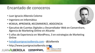 Este documento presenta WordPress como una plataforma para crear una web profesional y centro de la estrategia online. Explica conceptos como objetivos de la web, microconversiones, monetización, estructuras recomendadas y las diferencias entre WordPress.com y WordPress.org. El documento también cubre temas como plataformas web alternativas y estrategias de marketing digital.