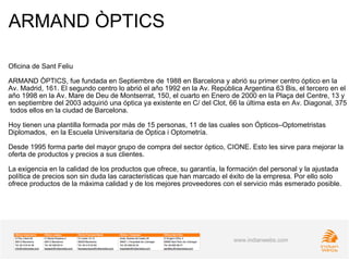 ARMAND ÒPTICS fue fundada en 1988 en Barcelona y ha abierto 6 centros ópticos en la ciudad desde entonces. Actualmente tiene más de 15 empleados, la mayoría de los cuales son ópticos-optometristas diplomados. Desde 1995 ha formado parte de un gran grupo de compra de óptica que le permite ofrecer una mejor selección de productos y precios a sus clientes. El éxito de la empresa se debe a su énfasis en la calidad de los productos, garantías, capacitación del personal y precios competitivos.