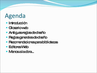 Este documento presenta una introducción al diseño web, incluyendo un glosario de términos comunes, antiguas reglas de diseño, reglas generales actuales y recomendaciones específicas para bibliotecas. Explica conceptos como navegadores, servidores, direcciones URL, lenguajes de programación y editores web. Recomienda realizar estudios de usabilidad con los usuarios, utilizar una terminología clara y consistente, y proveer información y enlaces de manera accesible para mejorar la experiencia del usuario.