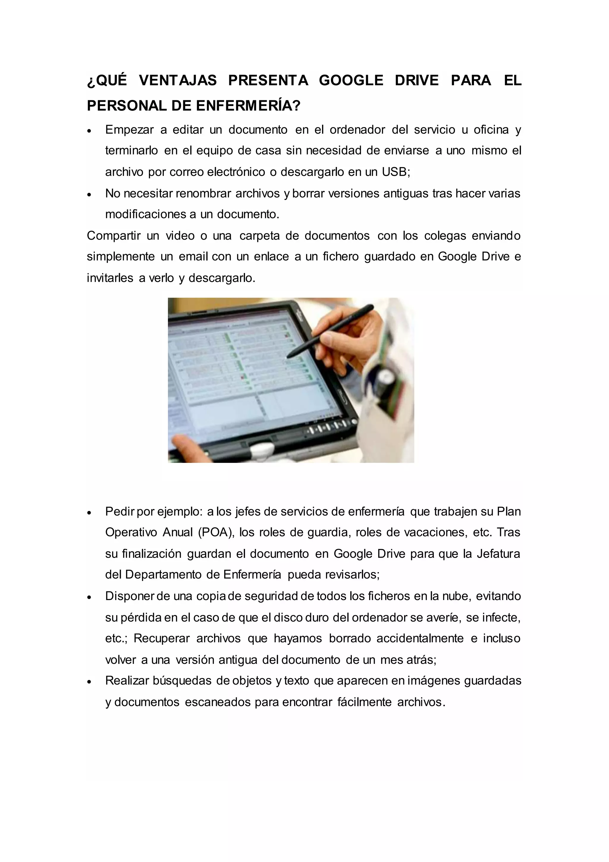 Este documento presenta las ventajas de varias herramientas web y ofimáticas aplicadas a la educación y enfermería, incluyendo Google Drive, Dropbox, Gmail, Hotmail, Blogger, Mendeley, SlideShare, GoConqr, Word, Excel y PowerPoint. Describe cómo estas herramientas pueden usarse para compartir archivos, realizar investigaciones, comunicarse y crear presentaciones de manera colaborativa y eficiente para el personal de enfermería.