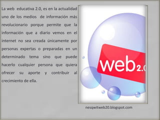 El documento describe la web educativa 2.0, la cual permite que los usuarios creen y compartan información de manera bidireccional e interactiva. La web educativa 2.0 fomenta el aprendizaje colaborativo y la participación de estudiantes y profesores. Gracias a la web educativa 2.0, los usuarios pueden acceder a recursos educativos y compartir conocimiento de manera más dinámica y satisfactoria que con la web 1.0.