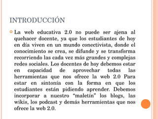 El documento discute la importancia de la web 2.0 en la educación, destacando que los docentes deben adaptarse a las herramientas digitales que los estudiantes utilizan, como blogs, wikis y podcasts. Se enfatiza que los contenidos son más relevantes que el diseño, y se presentan cuatro aspectos claves para trabajar con ellos: acceder, crear, recopilar y conectar contenidos. En resumen, la web 2.0 ofrece recursos accesibles que pueden enriquecer la enseñanza y el aprendizaje en un entorno conectivista.