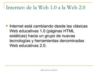El documento describe la evolución de la Web educativa de la Web 1.0 a la Web 2.0, donde el usuario pasa de ser consumidor a participar en la construcción de contenidos. Explica que la Web 2.0 permite realizar tareas en línea sin necesidad de software específico. Entre las herramientas propias de la Web educativa 2.0 se encuentran blogs, wikis y plataformas de enseñanza virtual como Moodle, que fomentan un aprendizaje colaborativo. También menciona los objetos digitales de aprendizaje y