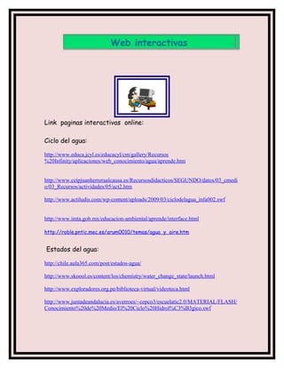 Este documento proporciona enlaces a varias páginas web interactivas sobre el ciclo del agua y los estados del agua. Incluye 10 enlaces que llevan a recursos educativos en línea sobre cómo funciona el ciclo del agua, incluidas animaciones e interfaces interactivas, así como contenido sobre los diferentes estados del agua como sólido, líquido y gaseoso. El documento fue compartido por la profesora Elizabeth Daza López de la Escuela La Victoria.