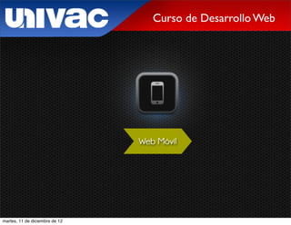 Este documento presenta la agenda de un curso de desarrollo web móvil. La agenda incluye introducción a la web móvil, aplicaciones nativas vs web, ventajas y desventajas de cada una, frameworks para desarrollo web móvil, etiquetas importantes y optimización para iOS.
