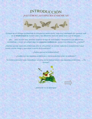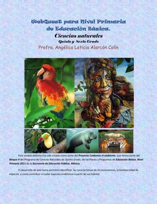 Este documento presenta una unidad didáctica sobre ciencias naturales para quinto y sexto grado de educación primaria. El objetivo es identificar las características de los ecosistemas, la biodiversidad de especies y cómo contribuir a la conservación de especies endémicas. Los estudiantes trabajarán en equipos para investigar sobre biodiversidad, especies endémicas en México, sus hábitats y estado de conservación. Cada equipo creará materiales como un cartel, folleto, presentación y periódico mural para compartir lo que apre