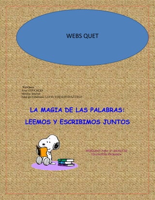 Este documento presenta una webquest dirigida a estudiantes de 2o grado de primaria sobre la lectura y escritura. La webquest guía a los estudiantes a través de nueve actividades para ayudar a personajes de cuentos a encontrar nuevas aventuras y así recuperar los cuentos para la clase. Las actividades incluyen el uso de un ratón, escuchar cuentos, escribir mensajes, enviar correos electrónicos e inventar sus propios cuentos.