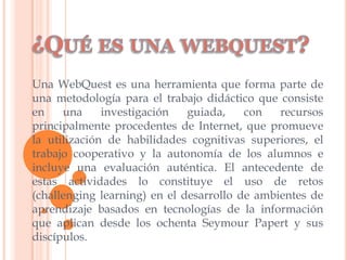 Una webquest es una herramienta metodológica que promueve la investigación guiada en línea, fomenta habilidades cognitivas superiores y el trabajo colaborativo en alumnos. Se basa en la resolución de tareas atractivas y no se debe confundir con una 'caza del tesoro', ya que busca un aprendizaje significativo más allá de contestar preguntas. Su diseño requiere un sitio web y puede ser utilizado en diversas duraciones y contextos educativos.