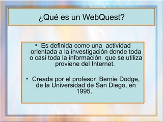 Un WebQuest es una actividad de investigación orientada donde la mayor parte de la información proviene de Internet. Consta de seis partes esenciales: introducción, tarea, proceso, recursos, evaluación y conclusión. El objetivo es que los estudiantes completen una tarea realizable siguiendo los pasos descritos y utilizando los recursos provistos. Para crear un WebQuest se necesita una computadora con acceso a Internet y habilidades básicas de edición web.