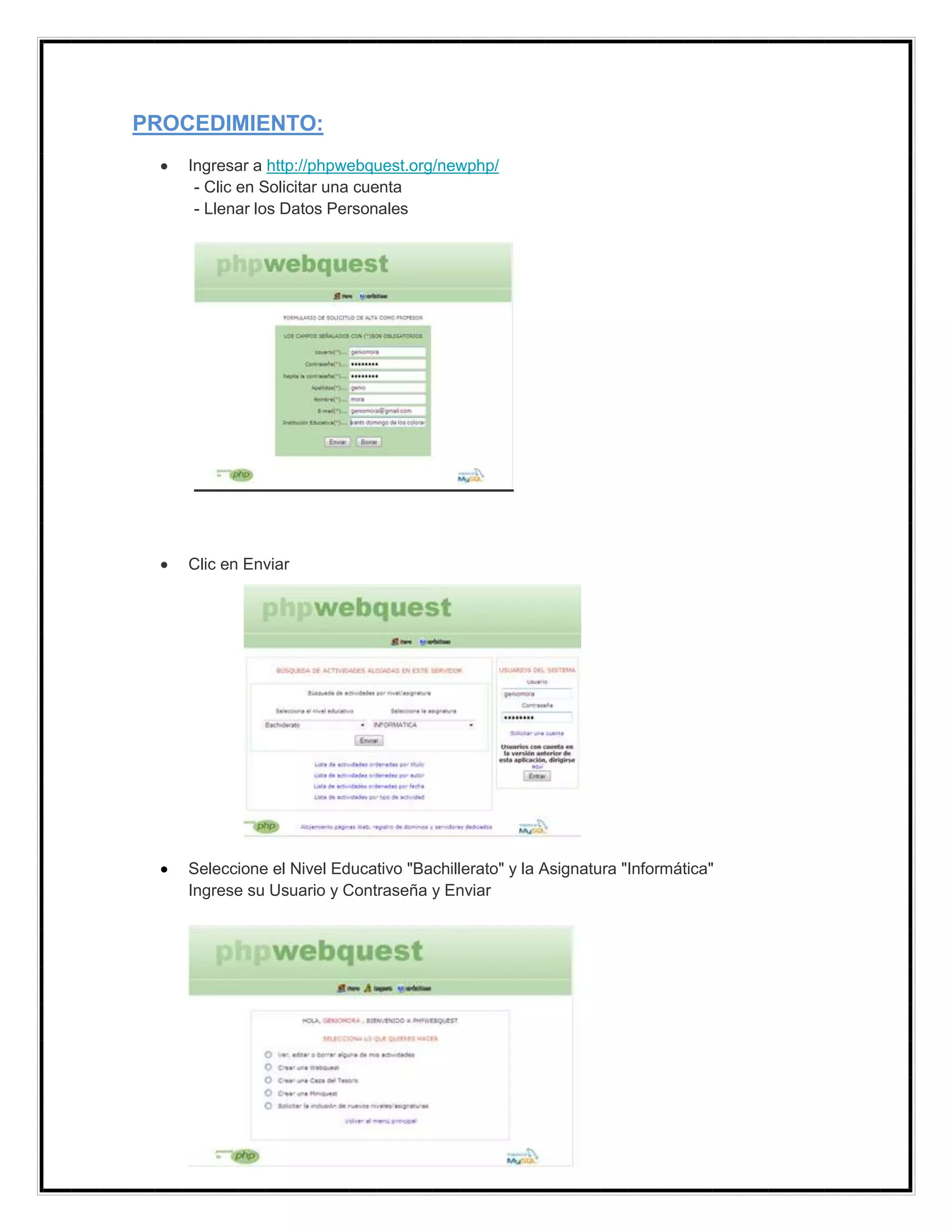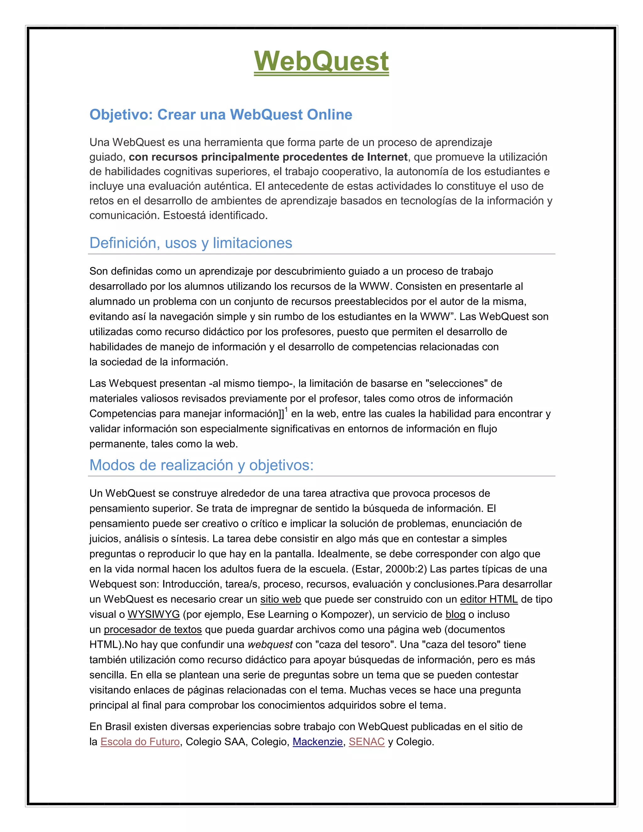 Un WebQuest es una herramienta de aprendizaje guiado que utiliza recursos de Internet para promover habilidades cognitivas superiores y trabajo cooperativo. Un WebQuest consta típicamente de una introducción, tarea, proceso, recursos, evaluación y conclusiones. El objetivo es impregnar la búsqueda de información con sentido mediante el pensamiento crítico o creativo para resolver problemas.