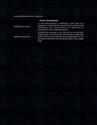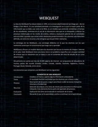 La WebQuest es una actividad de investigación desarrollada en 1995 que utiliza recursos en Internet. Se centra en usar la información en lugar de buscarla y reforzar procesos intelectuales como el análisis y la síntesis. Una WebQuest define claramente una tarea y proporciona recursos y guías para que los estudiantes construyan el conocimiento de forma autónoma. Existen WebQuests cortas, para una o dos clases, y largas, para una semana o mes, que culminan en presentaciones más profundas.