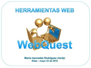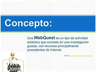 Una WebQuest es una actividad didáctica guiada que utiliza recursos de Internet. Se usa para desarrollar habilidades relacionadas con la sociedad de la información y promover el trabajo cooperativo y la autonomía de los estudiantes. Una WebQuest típicamente incluye una tarea, recursos, y procesos para guiar a los estudiantes a pensar de forma crítica y creativa.