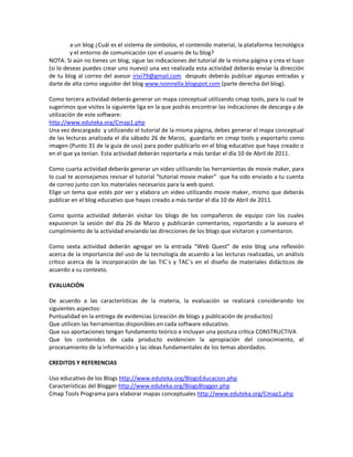 El documento detalla un plan de actividades para educadores del grupo Huauchinango, enfocándose en el uso responsable de tecnologías de la información y la comunicación (TIC) en la educación. Se proponen actividades que incluyen la creación de blogs, elaboración de mapas conceptuales mediante cmap tools, y producción de videos educativos con Movie Maker. Además, el documento establece un cronograma para la entrega de tareas y criterios de evaluación basado en la puntualidad y la calidad del contenido educativo producido.