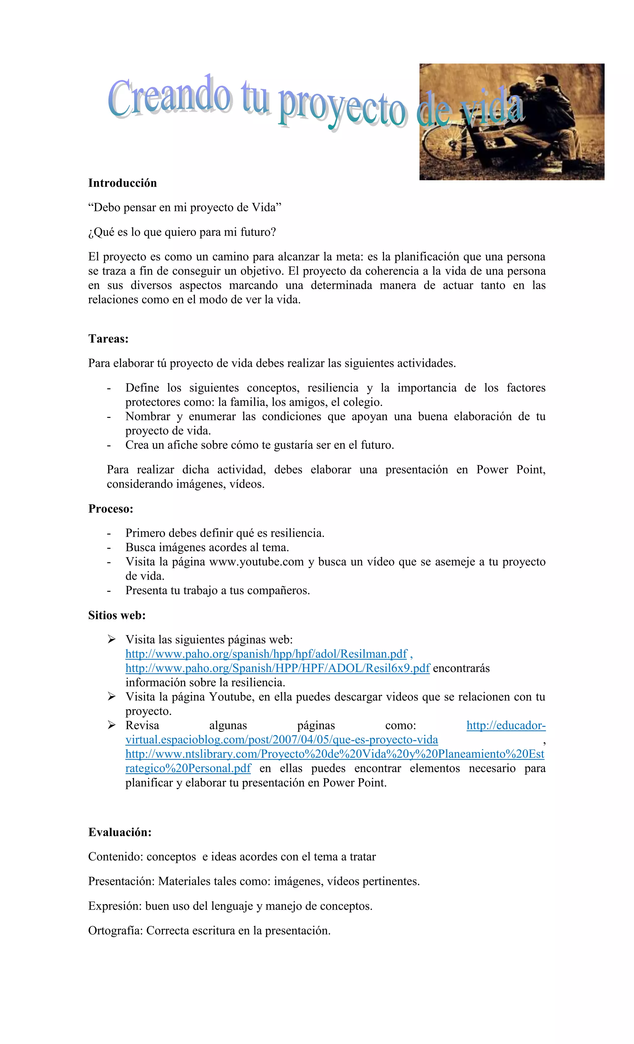 Este documento proporciona instrucciones para que los estudiantes elaboren su propio proyecto de vida. Sugiere definir los conceptos de resiliencia y factores protectores como la familia y los amigos, y enumerar las condiciones que apoyan un buen proyecto de vida. Luego instruye a los estudiantes a crear un afiche sobre cómo les gustaría ser en el futuro usando PowerPoint con imágenes y videos, y presentarlo a sus compañeros. Finalmente, recomienda sitios web para obtener más información sobre resiliencia y proyectos de