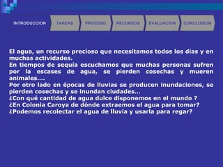Este documento presenta información sobre el agua como un recurso valioso. Propone varias tareas para que los estudiantes aprendan sobre el ciclo del agua, su distribución en la Tierra, usos y contaminación. También incluye recursos en línea sobre estos temas y la historia del canal San Carlos, importante para el abastecimiento de agua de la región.