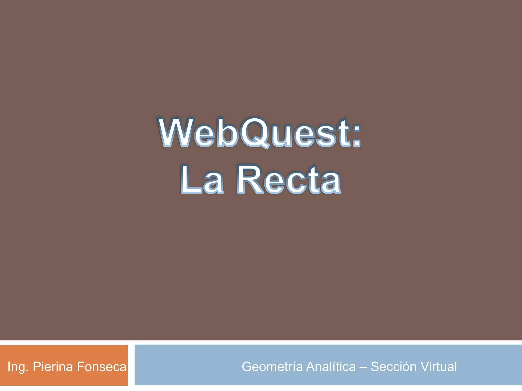 Este documento presenta un WebQuest sobre rectas para ser resuelto por parejas de estudiantes. Instruye a los estudiantes a resolver ejercicios prácticos sobre rectas incluyendo ecuaciones de rectas, ángulos entre rectas, paralelismo y perpendicularidad. Los estudiantes deben escanear y enviar sus respuestas en un archivo PDF. Se proveen videos tutoriales como recursos de apoyo y los ejercicios serán evaluados considerando el desarrollo y resultado de cada uno.