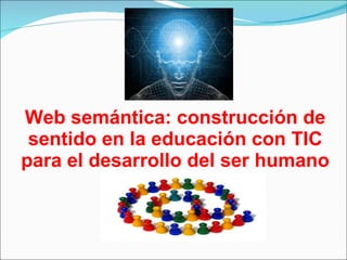 La Web Semántica extiende la World Wide Web permitiendo que la información en la web sea entendida y procesada por máquinas, lo que facilita que los usuarios encuentren respuestas más rápido. Fue creada por Tim Berners-Lee y el W3C trabaja en mejorarla y estandarizar sus lenguajes. En la educación, la Web Semántica permite a los estudiantes realizar búsquedas basadas en significado que mejoran la comprensión y el aprendizaje.