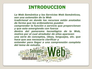 La Web Semántica y los Servicios Web Semánticos son una extensión de la Web tradicional que permite a los ordenadores comprender mejor la información y los recursos en la Web. Fueron creados por Tim Berners-Lee y existen estándares como RDF, OWL y XML para describir los recursos de una manera que las máquinas puedan procesar y entender. La Web Semántica ampliará el potencial de la Web permitiendo el intercambio de datos con un mayor significado entre máquinas.