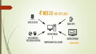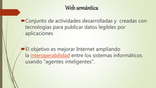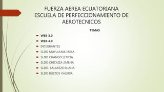 Este documento presenta información sobre la Web 3.0, Web 4.0 e integrante de un equipo. Describe las características de la Web semántica, Web 3.0 y Web 4.0, incluyendo su evolución hacia una mayor interconectividad y capacidades como el reconocimiento de voz y acceso ubicuo a la información. También presenta los nombres y roles de varios integrantes de un equipo que estudia estos temas.