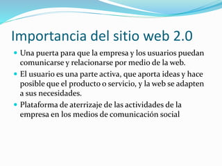 Este documento describe la importancia de los sitios web 2.0 y la comunicación social para las empresas. Recomienda que las empresas definan un plan estratégico con metas, objetivos y métricas para hacer un uso efectivo de estas plataformas. También sugiere que las empresas identifiquen a sus audiencias clave, como clientes actuales y potenciales, e implementen una estrategia de relación para lograr objetivos como fidelización, ventas y construcción de marca.