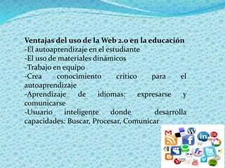 El documento describe las ventajas de usar la Web 2.0 en la educación, como el autoaprendizaje, uso de materiales dinámicos y trabajo en equipo. Sin embargo, la autora cree que su institución educativa no está lista para implementarla completamente debido a que muchos docentes no saben usar computadoras y hace falta capacitarlos. Ella usa YouTube y Google Docs en sus clases para enseñar con videos, música y documentos compartidos.