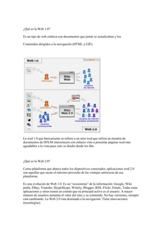 El documento resume la diferencia entre la Web 1.0 y la Web 2.0. La Web 1.0 consistía en páginas web estáticas con contenido que no se actualizaba, mientras que la Web 2.0 es más dinámica y centrada en los usuarios, con sitios como Google, Wikipedia, eBay y YouTube que permiten a los usuarios crear y compartir contenido. También define conceptos clave relacionados como nativos digitales, inmigrantes digitales y alfabetización digital.