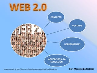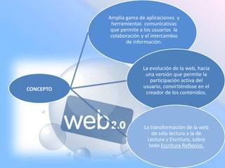 El documento describe la Web 2.0, la cual permite a los usuarios colaborar y compartir información a través de aplicaciones y herramientas de comunicación. La Web 2.0 transformó la web de solo lectura a una que permite la creación de contenido por parte de los usuarios. Algunas herramientas clave de la Web 2.0 incluyen blogs, wikis, redes sociales y sitios para compartir videos, fotos y podcasts.