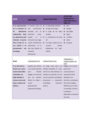 Este documento describe las características de la Web 2.0 y los sitios que permiten su creación. Explica que la Web 2.0 representa la evolución de las aplicaciones tradicionales hacia aplicaciones web centradas en el usuario. Menciona que el etiquetado colectivo, los blogs, las redes sociales y el contenido generado por los usuarios son ejemplos de aplicaciones que facilitan el compartir de contenido. También describe las características de los blogs y menciona algunas herramientas gratuitas para su creación como Blogger, WordPress y otros.