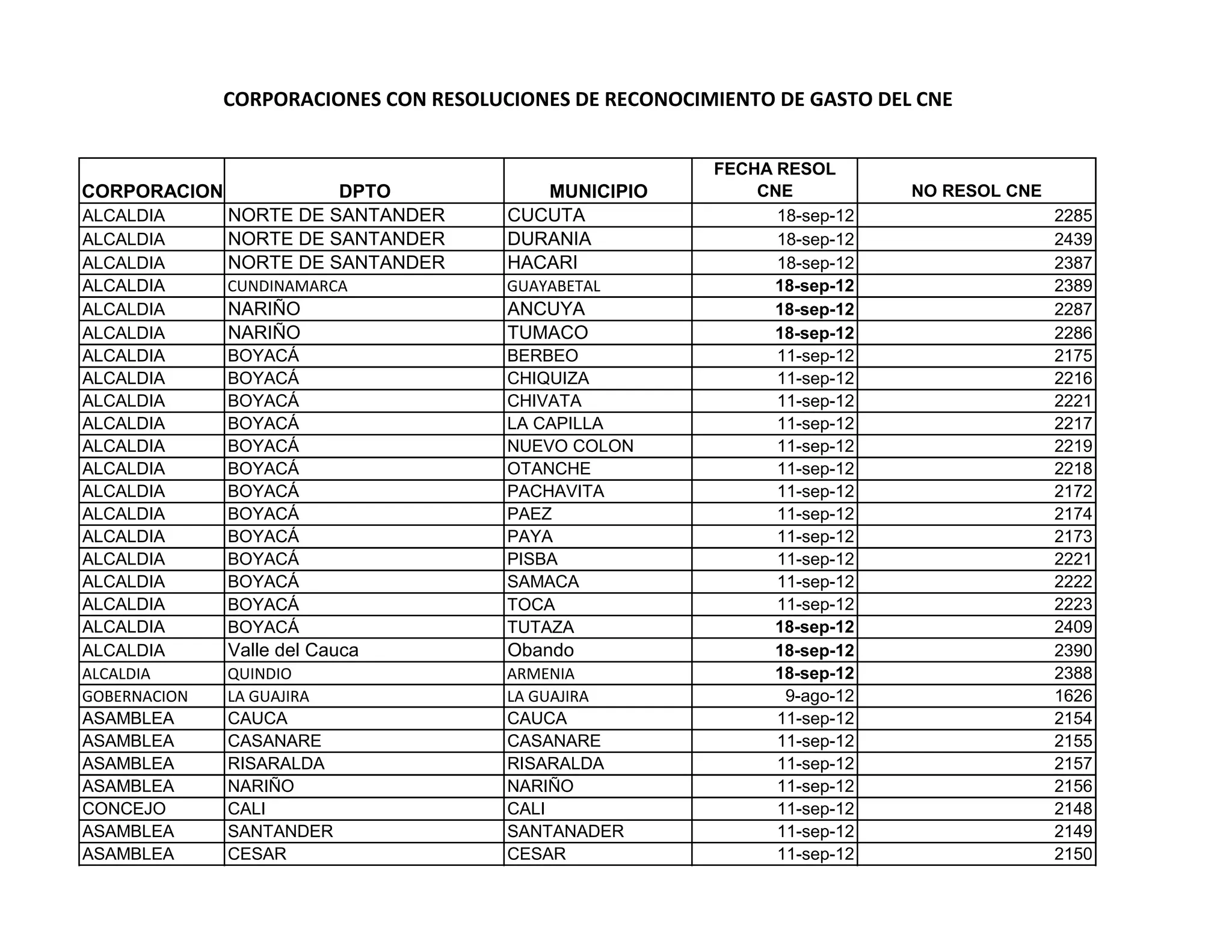 Este documento presenta una tabla con información sobre corporaciones públicas a las que el Consejo Nacional Electoral ha aprobado el reconocimiento de gastos. La tabla incluye el nombre de la corporación, el departamento y municipio al que pertenece, la fecha de la resolución del CNE aprobando el reconocimiento y el número de resolución. Las corporaciones incluyen alcaldías, gobernaciones, asambleas y concejos de diferentes departamentos de Colombia.