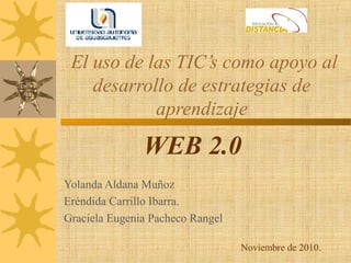 La Web 2.0 permite a los usuarios controlar y compartir información a través de aplicaciones como wikis, blogs y redes sociales. Facilita la innovación distribuida y el aprendizaje colaborativo. Wikipedia es un ejemplo exitoso como enciclopedia en línea editable por cualquier persona. La Web 2.0 ha provocado un cambio en los usuarios al volverse una parte importante de sus vidas y un reflejo de la sociedad.