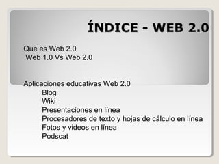 Este documento describe las herramientas de Web 2.0 y sus usos educativos. Explica que Web 2.0 se refiere a una segunda generación de la Web basada en comunidades de usuarios y servicios como redes sociales, blogs, wikis y folksonomías que fomentan la colaboración. Luego compara Web 1.0 con Web 2.0 y describe herramientas como blogs, wikis y podcasts, explicando sus definiciones y usos educativos.
