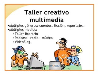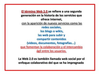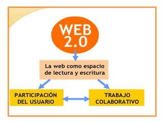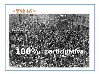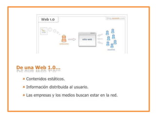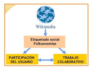 El documento habla sobre los conceptos de Web 2.0, RSS, folksonomía, netiqueta y podcasting. La Web 2.0 se refiere a una segunda generación de servicios en Internet que fomentan la colaboración a través de redes sociales, blogs y wikis. RSS permite distribuir contenidos digitales como videos y fotos para su futuro acceso. La folksonomía surge del etiquetado libre de contenidos por usuarios para mejorar su recuperación. La netiqueta establece normas de comportamiento en Internet equivalentes a la etiqueta en el mundo real. El