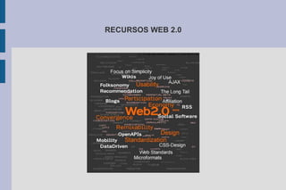 El documento describe Web 2.0 y algunos recursos web 2.0 como YouTube, Wikipedia, CmapTools y Google Docs que permiten la colaboración y participación de los usuarios en la creación y distribución de contenido en línea.
