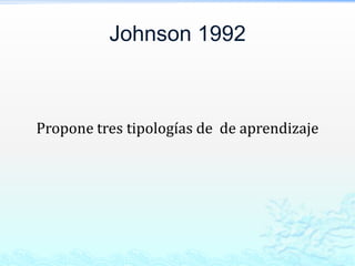 El documento propone cuatro tipos de aprendizaje: aprender haciendo, aprender interactuando, aprender buscando, y una cuarta denominada aprender compartiendo, la cual sugiere que el intercambio abierto es fundamental para el aprendizaje.